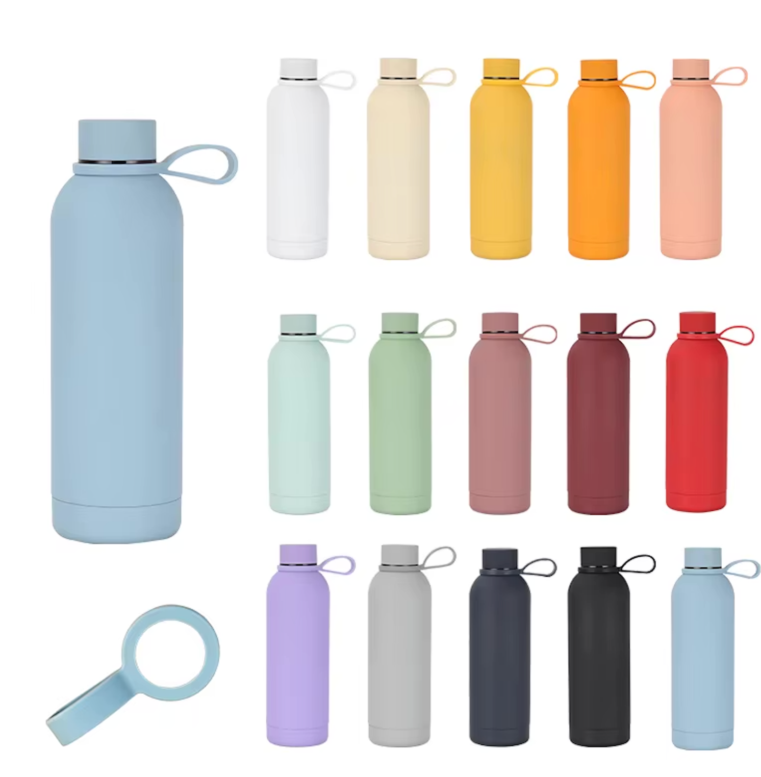 Bouteille d'eau isotherme à double paroi en acier inoxydable avec poignée en silicone, logo personnalisé, toucher doux, 500ml